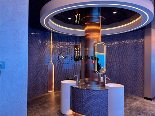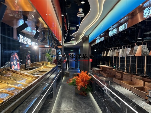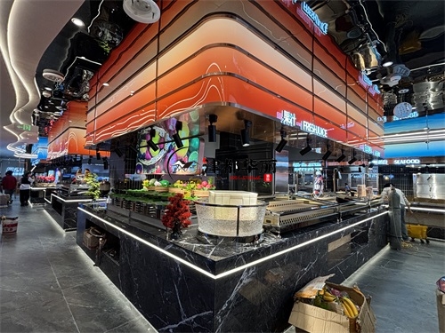今天分享的是彭阳回香渔自助餐厅装修设计实景,这家自助餐厅装修设计将“潮流科技感”与“轻奢休闲风”两种风格巧妙融合在一起,既贴合当下年轻消费群体的审美偏好,又通过空间层次的营造兼顾了自助餐饮的功能需求,是近年餐饮空间设计的典型流行范式。前厅的顶面与墙面采用波浪形的曲面造型,搭配橙红、宝蓝等高饱和度渐变色彩,叠加内嵌式线性灯带的勾勒,既打破了传统餐厅的规整感,又通过科技感的光影营造出“赛博休闲”的氛围——这种手法既借鉴了网红餐饮的“打卡属性”设计,又通过色彩分区(如橙红对应热菜区、宝蓝对应海鲜区)实现了功能引导,让顾客能快速识别餐区类型。
